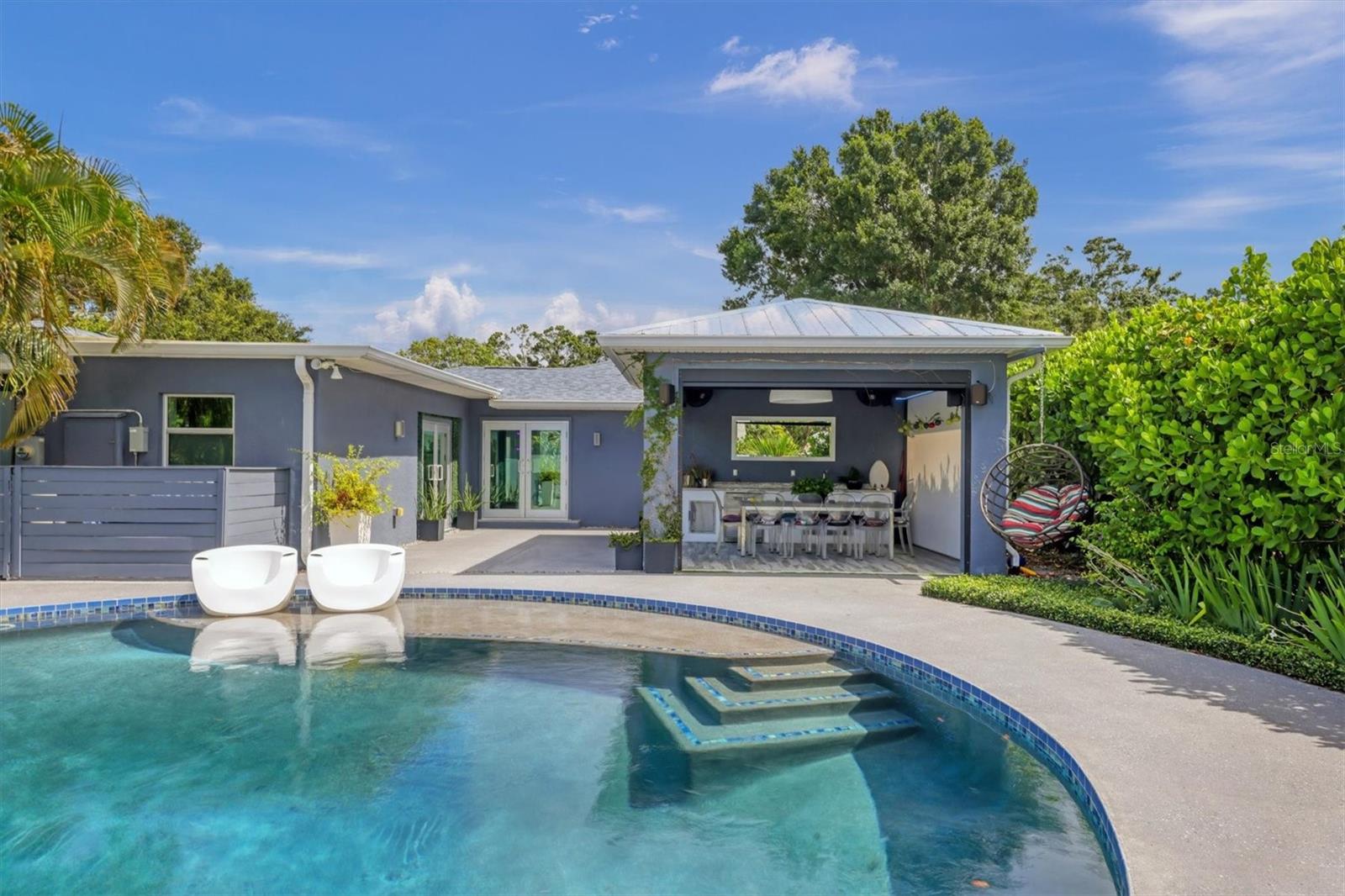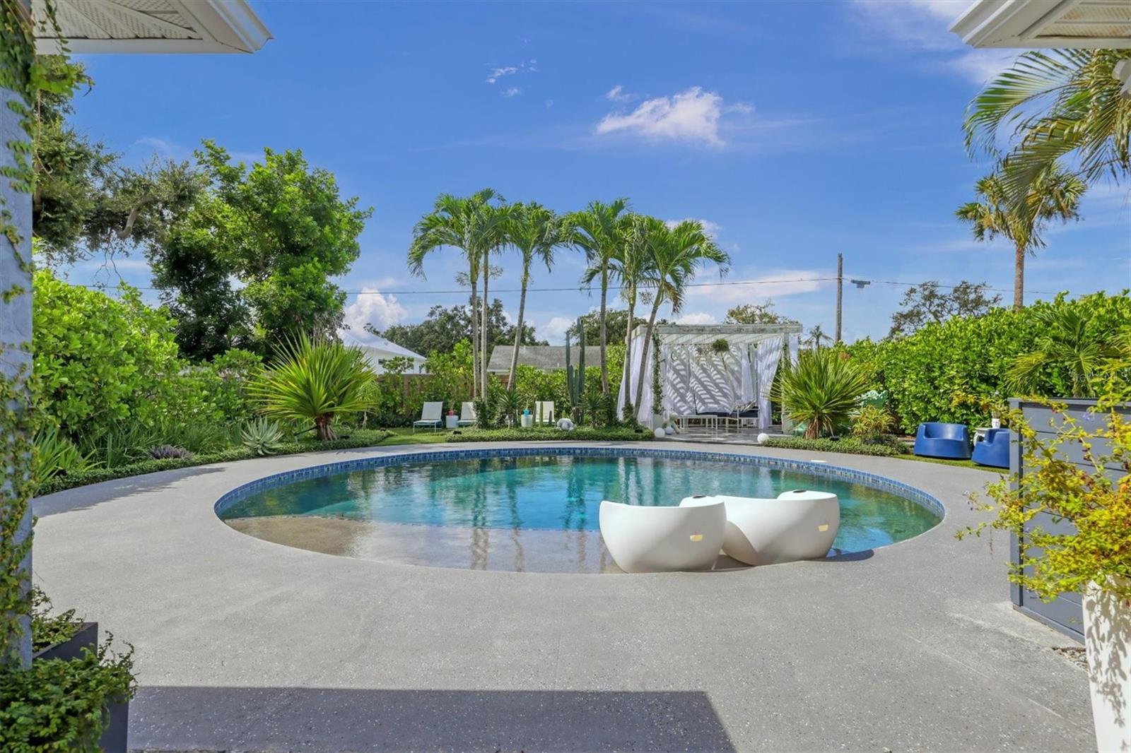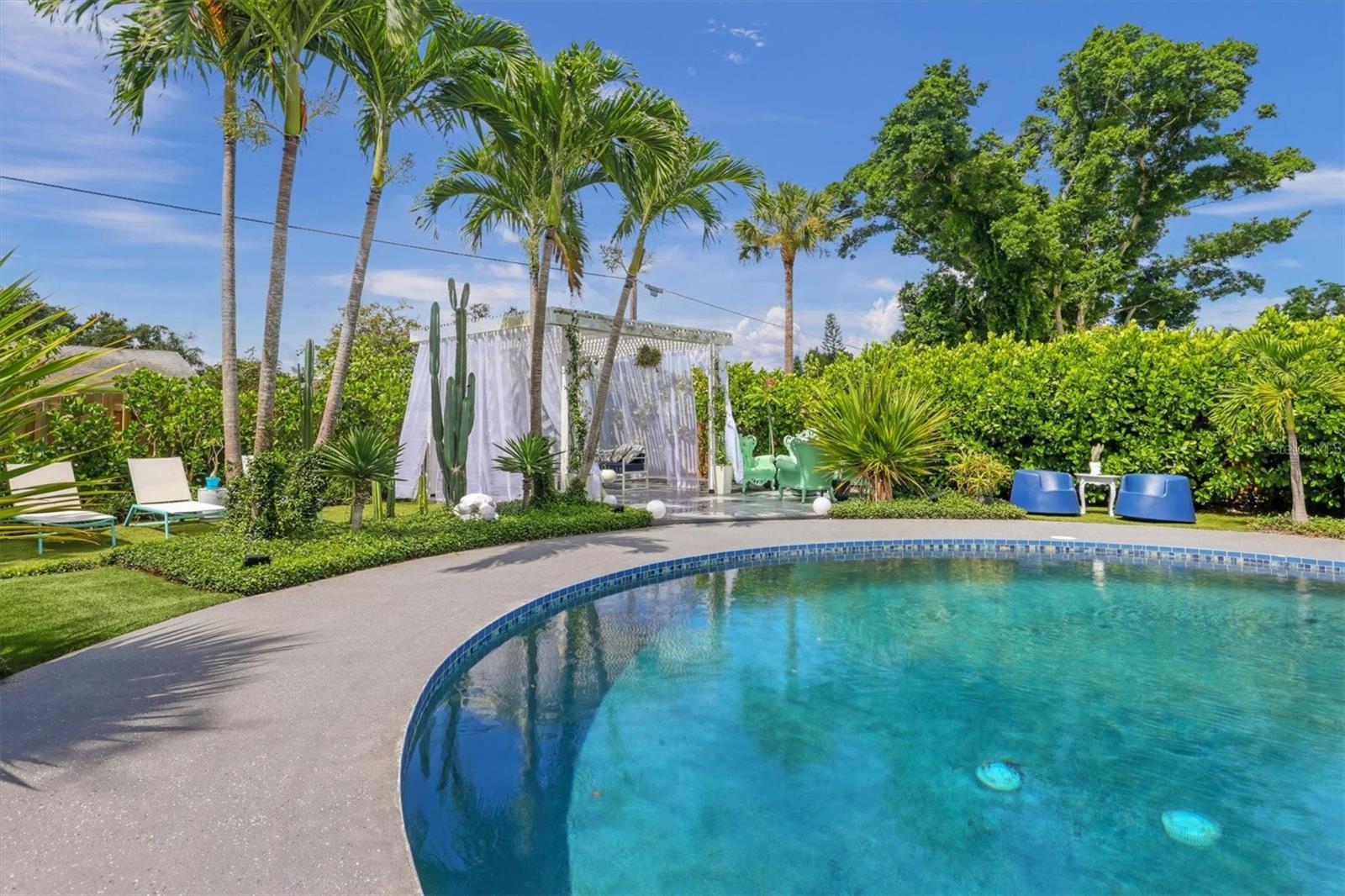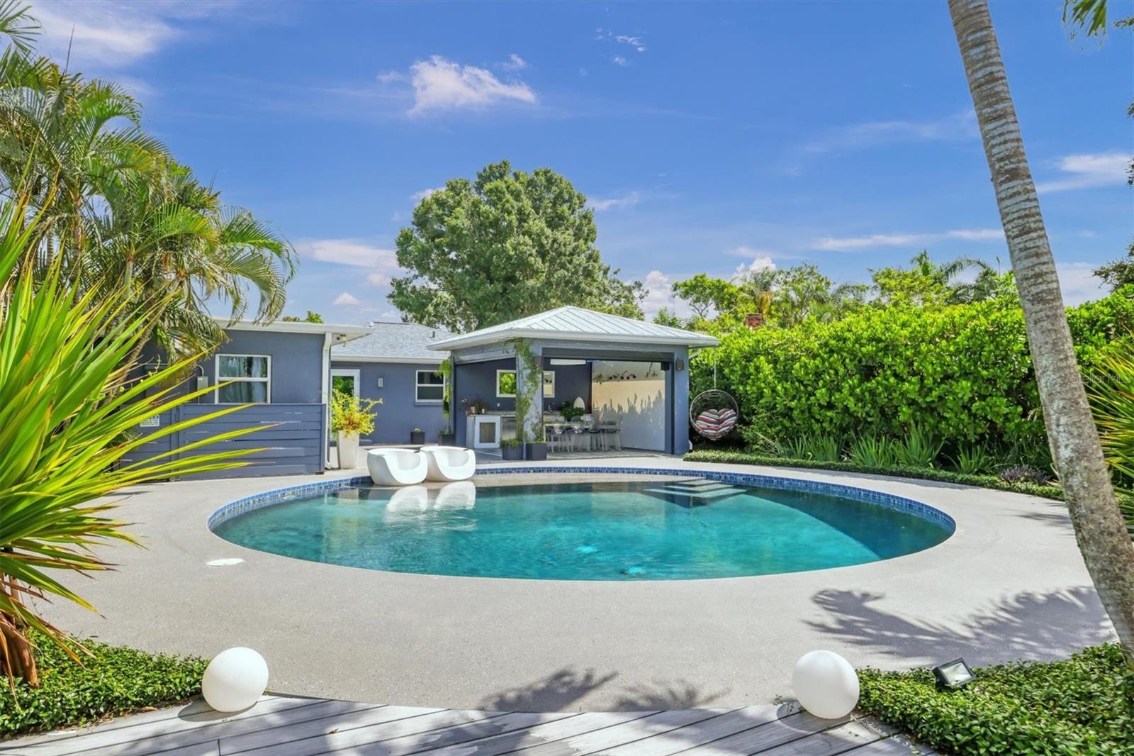 Tucked behind a lush hedge and wrapped in the charm of Old Florida, this beautifully transformed 1950s bungalow offers the serenity of a private hideaway blended with modern sophistication. From the moment you arrive, you'll sense the tranquility and seclusion this 3-bedroom, 2-bath pool home provides--a true sanctuary from the outside world. Step inside and discover a space that has been reimagined, where every element speaks of quiet luxury and comfort. The rich glow of luxury vinyl floors flows throughout, grounding the home in warmth and elegance. Carefully chosen wood doors with frosted glass add texture and refinement, while custom blinds and sleek ceiling fans carry the modern aesthetic effortlessly from room to room. Every detail has been curated with thought and intention--from heated towel racks to bidet-style toilets offering spa-like indulgence. The kitchen is a gleaming showcase of both function and style. A stunning stainless steel accent wall contrasts beautifully with the Fisher & Paykel pull-out dishwashers, a five-burner gas range, Italian range hood, and built-in KitchenAid microwave and oven. Every cabinet has pull-out drawers for seamless organization. This culinary space is perfect for both day-to-day living and joyful entertaining. The primary suite is a spacious retreat, featuring four closets--including a walk-in--and a split A/C system for personalized comfort. A retractable-mounted TV adds versatility, while the en suite bath is a study in sophistication with a shower/tub combo and a beautifully tiled ceiling. All infrastructure has been updated--from plumbing and electrical to a brand-new roof, new A/C unit, impact-rated windows, and commercial-grade impact doors. This home is not only visually captivating but also move-in ready with peace of mind built in. The backyard is where this home truly shines. Step into your own private Eden, with a rare round pool at its center. Decking extends toward a draped gazebo, where sheer curtains sway in the breeze. Magnificent garden beds and mature plantings wrap around the pool, leading to a second pavilion outfitted with a sink, fridge, built-in BBQ, and remote-controlled screens for added comfort. Surround sound flows through the garden, enhancing every alfresco gathering, swim, or quiet moment. Low-maintenance artificial turf keeps the grounds pristine, allowing the vibrant greenery to take center stage. Whether entertaining or enjoying downtime, you'll never want to leave. The front yard features a tranquil water feature and a wraparound deck leading to a shaded bench and sitting area. The natural barrier of hedges provides privacy from the street, echoing the quiet grace found throughout the property. This is not just a house--it's a retreat, a sanctuary, a daily escape into beauty and ease. Whether you're relaxing under the gazebo, preparing a meal in the gourmet kitchen, or simply enjoying the garden from your bedroom window, this home blends indoor luxury with outdoor splendor, making every day feel like a holiday. Located in the highly sought-after Southgate neighborhood, this property offers a coveted address in Sarasota, renowned for its central convenience and inclusion in the area's top-rated school district. Just a 10-minute drive to the world-famous white sands of Siesta Beach, and only about 8 minutes to vibrant downtown Sarasota, with dining, entertainment, and the popular Farmers Market.