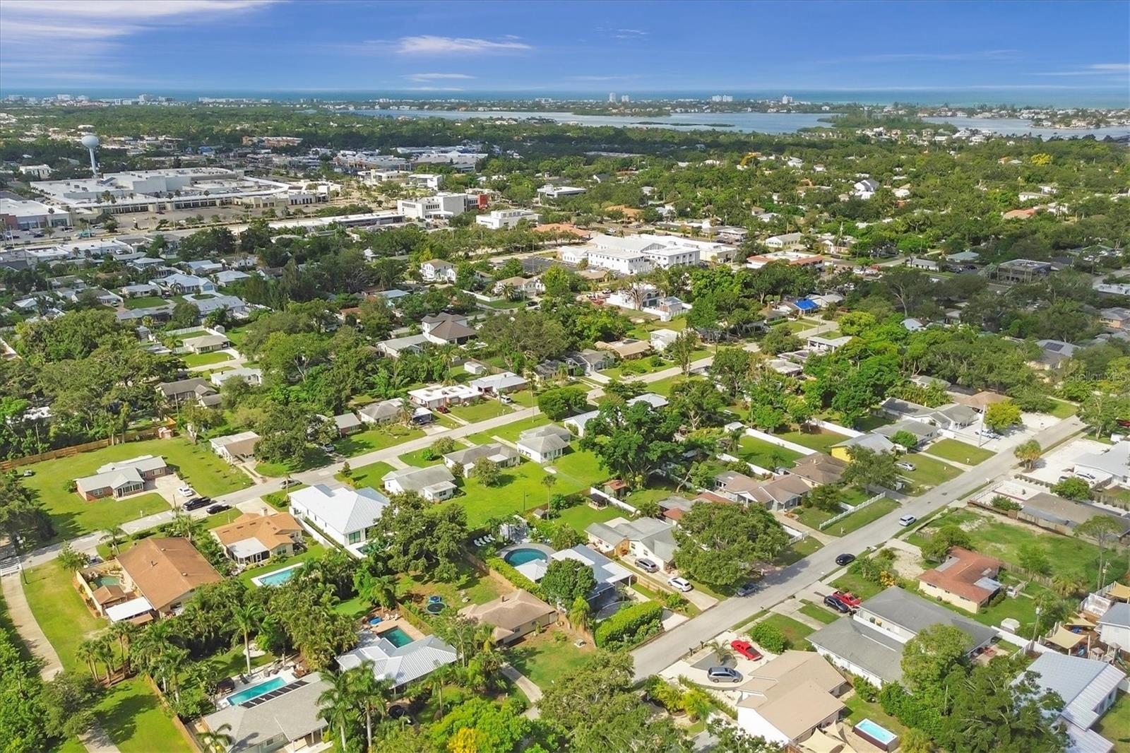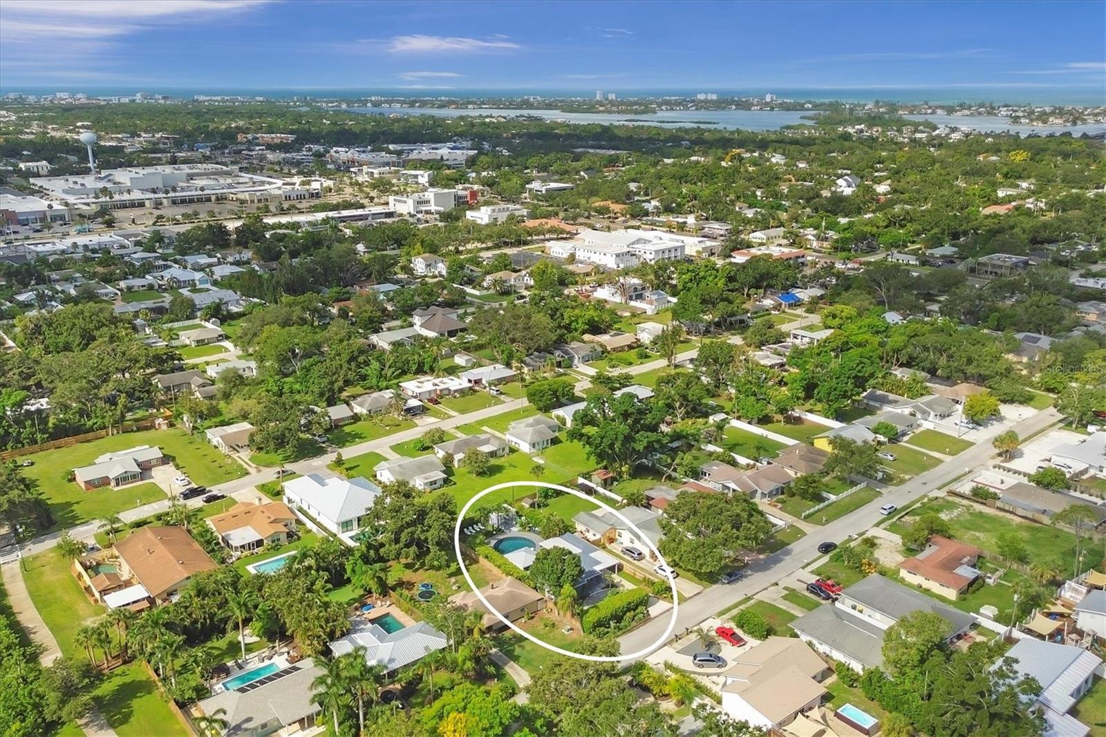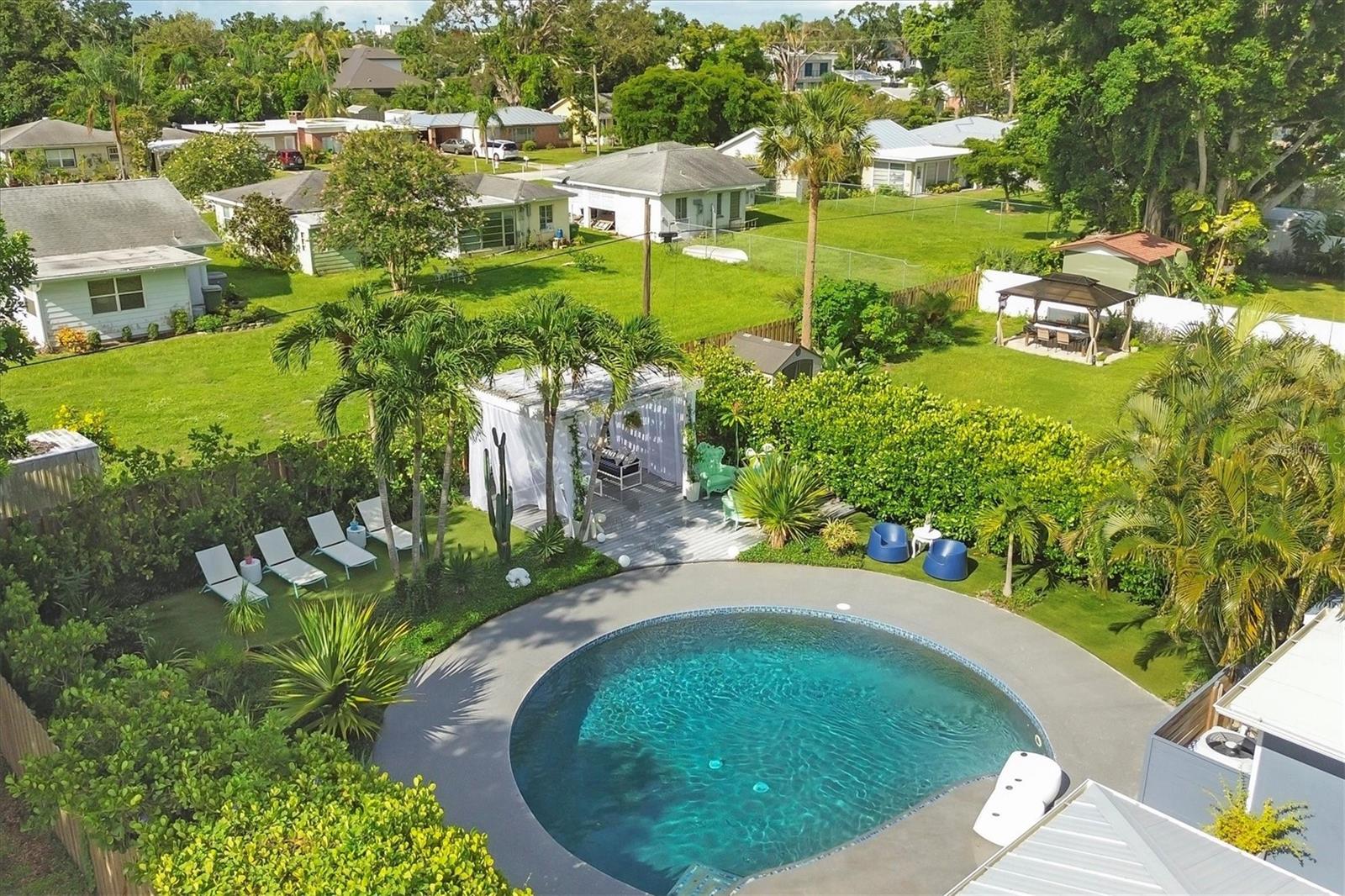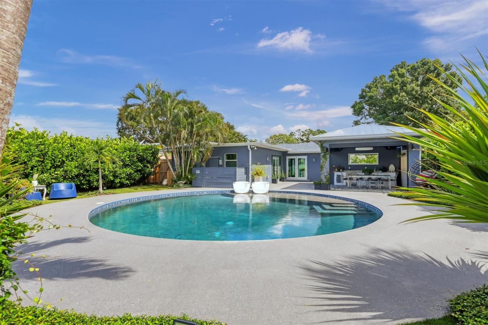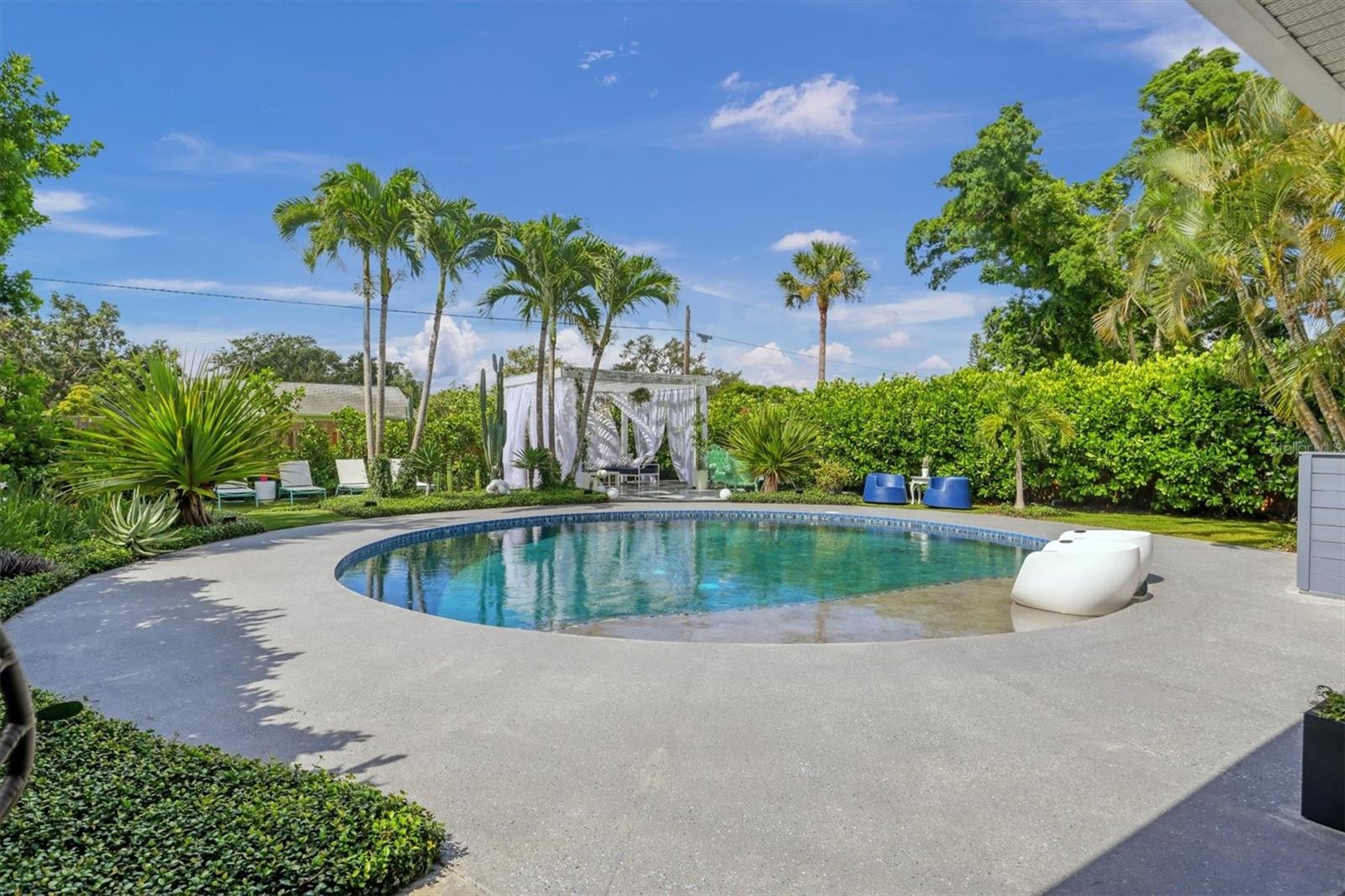 Tucked behind a lush hedge and wrapped in the charm of Old Florida, this beautifully transformed 1950s bungalow offers the serenity of a private hideaway blended with modern sophistication. From the moment you arrive, you'll sense the tranquility and seclusion this 3-bedroom, 2-bath pool home provides--a true sanctuary from the outside world. Step inside and discover a space that has been reimagined, where every element speaks of quiet luxury and comfort. The rich glow of luxury vinyl floors flows throughout, grounding the home in warmth and elegance. Carefully chosen wood doors with frosted glass add texture and refinement, while custom blinds and sleek ceiling fans carry the modern aesthetic effortlessly from room to room. Every detail has been curated with thought and intention--from heated towel racks to bidet-style toilets offering spa-like indulgence. The kitchen is a gleaming showcase of both function and style. A stunning stainless steel accent wall contrasts beautifully with the Fisher & Paykel pull-out dishwashers, a five-burner gas range, Italian range hood, and built-in KitchenAid microwave and oven. Every cabinet has pull-out drawers for seamless organization. This culinary space is perfect for both day-to-day living and joyful entertaining. The primary suite is a spacious retreat, featuring four closets--including a walk-in--and a split A/C system for personalized comfort. A retractable-mounted TV adds versatility, while the en suite bath is a study in sophistication with a shower/tub combo and a beautifully tiled ceiling. All infrastructure has been updated--from plumbing and electrical to a brand-new roof, new A/C unit, impact-rated windows, and commercial-grade impact doors. This home is not only visually captivating but also move-in ready with peace of mind built in. The backyard is where this home truly shines. Step into your own private Eden, with a rare round pool at its center. Decking extends toward a draped gazebo, where sheer curtains sway in the breeze. Magnificent garden beds and mature plantings wrap around the pool, leading to a second pavilion outfitted with a sink, fridge, built-in BBQ, and remote-controlled screens for added comfort. Surround sound flows through the garden, enhancing every alfresco gathering, swim, or quiet moment. Low-maintenance artificial turf keeps the grounds pristine, allowing the vibrant greenery to take center stage. Whether entertaining or enjoying downtime, you'll never want to leave. The front yard features a tranquil water feature and a wraparound deck leading to a shaded bench and sitting area. The natural barrier of hedges provides privacy from the street, echoing the quiet grace found throughout the property. This is not just a house--it's a retreat, a sanctuary, a daily escape into beauty and ease. Whether you're relaxing under the gazebo, preparing a meal in the gourmet kitchen, or simply enjoying the garden from your bedroom window, this home blends indoor luxury with outdoor splendor, making every day feel like a holiday. Located in the highly sought-after Southgate neighborhood, this property offers a coveted address in Sarasota, renowned for its central convenience and inclusion in the area's top-rated school district. Just a 10-minute drive to the world-famous white sands of Siesta Beach, and only about 8 minutes to vibrant downtown Sarasota, with dining, entertainment, and the popular Farmers Market.