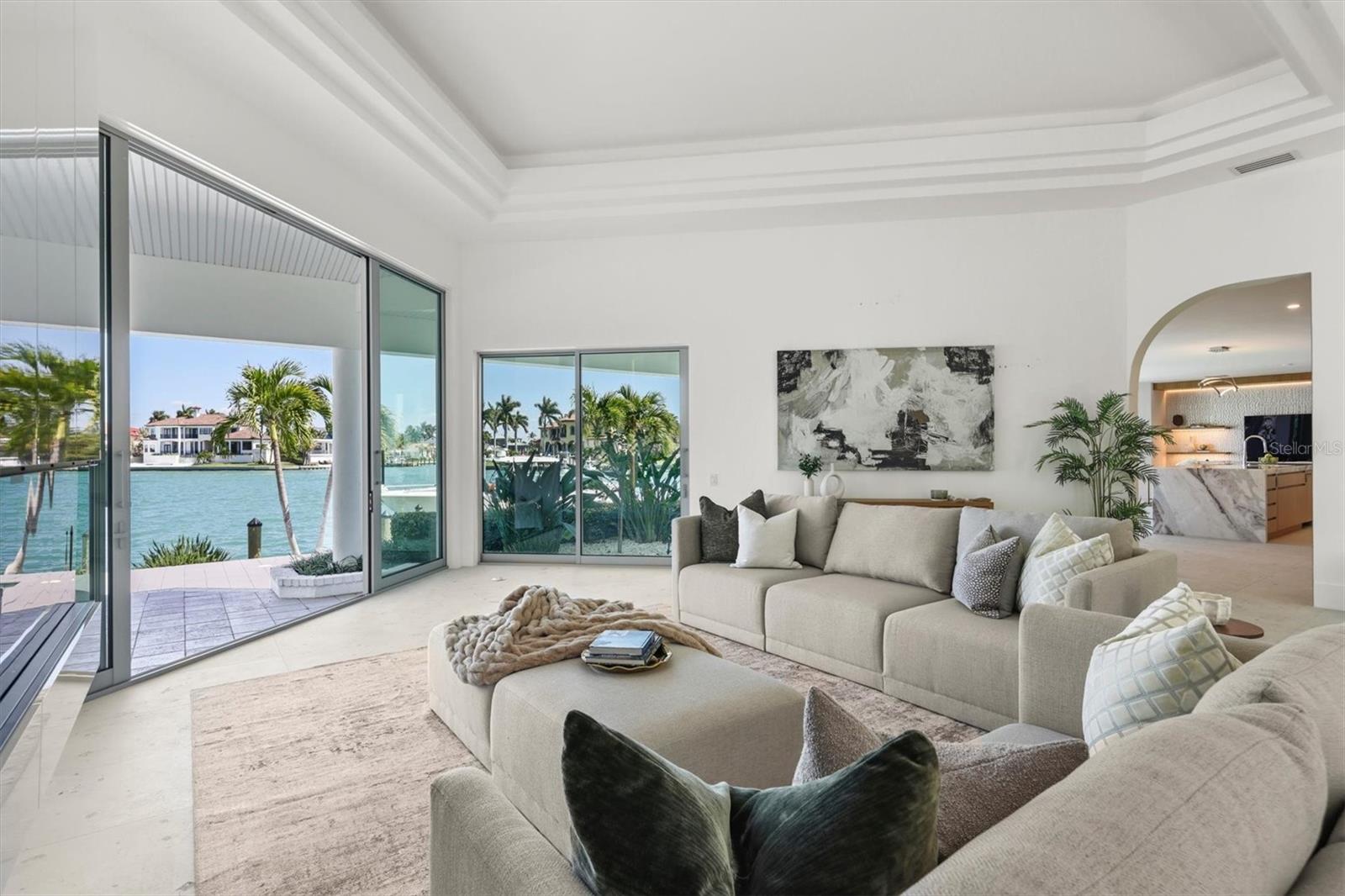 An exceptional opportunity on coveted Robin Drive in Bird Key, this fully reimagined bayfront home captures Sarasota's waterfront lifestyle at its finest. Recently transformed through a meticulous, top-tier renovation, the residence showcases impeccable craftsmanship, elevated finishes, and a seamless blend of sophistication and comfort--where every detail and major system has been thoughtfully curated for effortless, modern coastal living. Elevated above the floodplain with a ground level over 10 feet, sweeping panoramic views span Sarasota Bay, the downtown skyline, and the iconic Ringling Bridge--creating a breathtaking backdrop from sunrise to sunset, with city lights shimmering across the water in the evening. Inside, more than 4,000 square feet of light-filled living space unfolds across two thoughtfully designed levels. Soaring ceilings up to 14 feet and expansive walls of glass bathe the interiors with natural light while framing unobstructed bay views throughout. The main living areas flow seamlessly from the inviting sitting room with a statement fireplace to the dining area and custom-designed kitchen, opening to the family room with a built-in bar--a wonderful gathering area to enjoy the gorgeous backdrop of the bay and downtown lights. The kitchen is anchored by a striking waterfall island and features designer-appointed custom cabinetry, premium Sub-Zero, Wolf, Bosch, and Miele appliances, and refined integrated details throughout. A fully equipped back kitchen and pantry, complete with an additional sink, appliances, and generous prep space, enhances functionality while maintaining a clean, polished aesthetic. The primary suite, privately positioned on the main level, offers direct access to the pool, dual walk-in closets, and a spa-inspired bath with a soaking tub, dual vanities, and elegant finishes. A dedicated office and two powder baths complete the main level. Upstairs, two en-suite bedrooms with bay views, a versatile bonus room, and an additional office space provide comfortable accommodations for family and guests. Outdoor living is equally compelling, featuring an expansive paver terrace, heated pool and spa, and unobstructed views of Sarasota Bay, downtown, and the Ringling Bridge--creating a serene waterfront retreat designed for everyday enjoyment. Set on protected waters, the property offers 120 feet of deep-water frontage along Bird Key's Pompano Pass, with direct access to Sarasota Bay, Big Pass, and the Gulf. A newly constructed seawall and Trex dock feature fish and dock lighting, a 24,000-pound boat lift, and dedicated kayak and jet ski lifts--perfectly suited for an exceptional boating lifestyle. Additional highlights include a circular driveway, three-car garage with Tesla charger, and irrigation well. Bird Key offers an exceptional coastal lifestyle in one of Sarasota's most coveted neighborhoods, just moments from downtown's restaurants, shopping, and cultural venues, as well as the boutiques and dining of St. Armands Circle and the shoreline of Lido Beach. The Bird Key Yacht Club is currently undergoing a full redevelopment and is expected to reopen as a premier destination for boating, tennis, dining, and an active social scene.