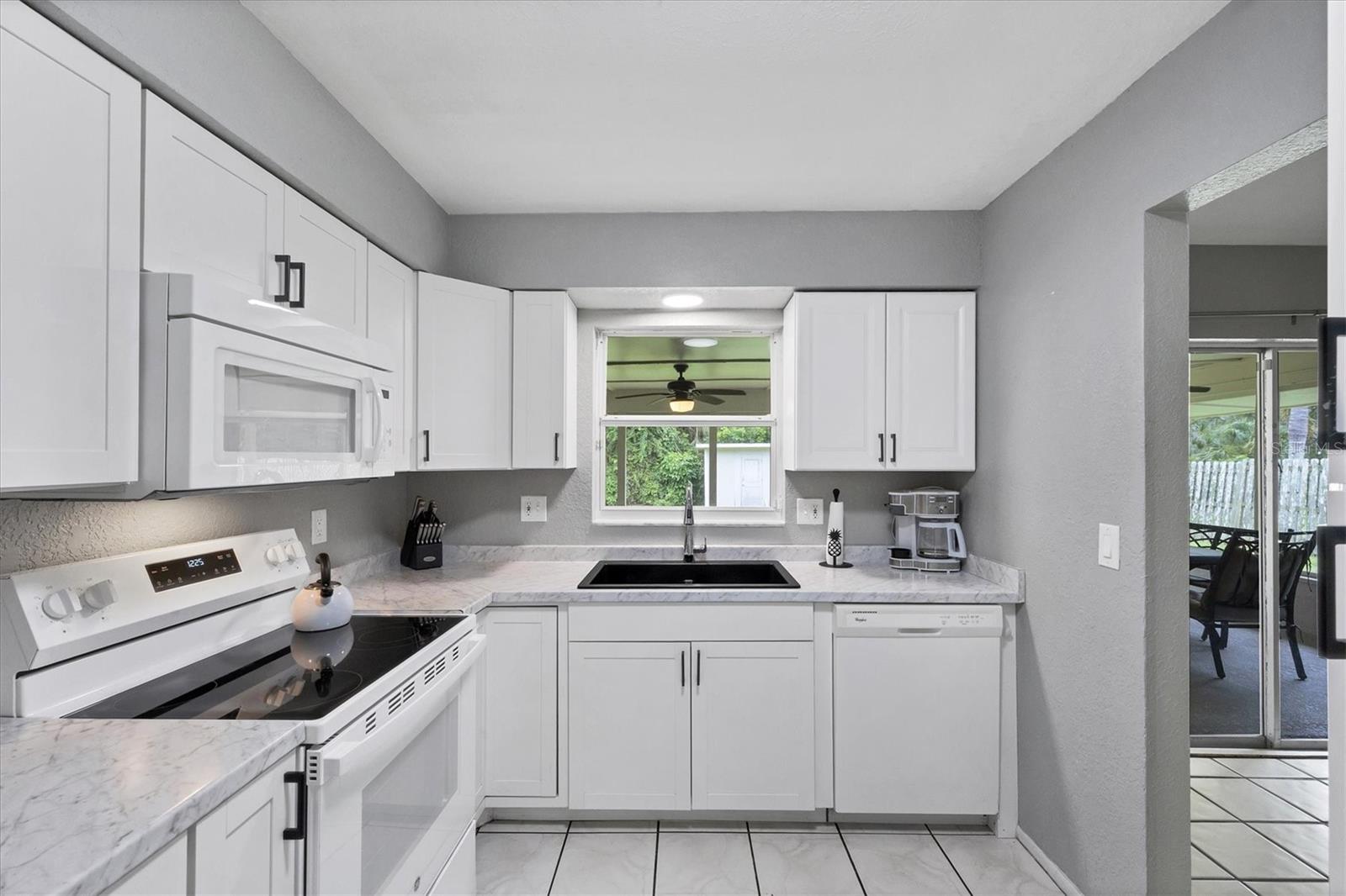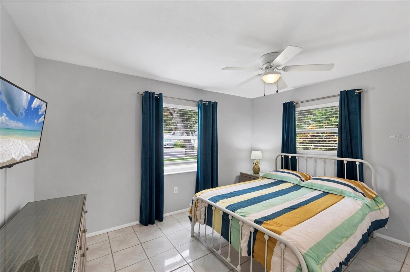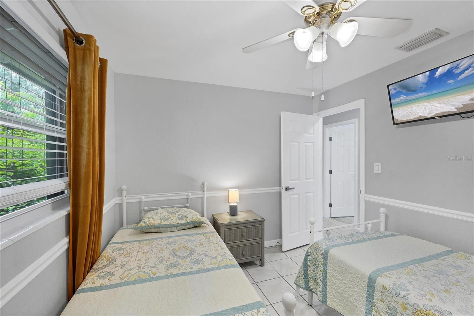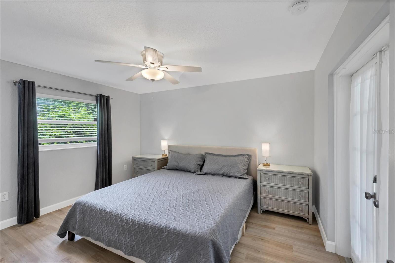 Step inside to find two tastefully remodeled bathrooms, showcasing sleek white and grey tile finishes that create a fresh, modern aesthetic. The spacious primary suite features an en-suite bathroom and French doors that open directly onto the screened-in porch, offering a seamless transition to your private outdoor oasis. The two guest bedrooms are bright and comfortable, each equipped with ceiling fans and window blinds for added privacy and comfort.