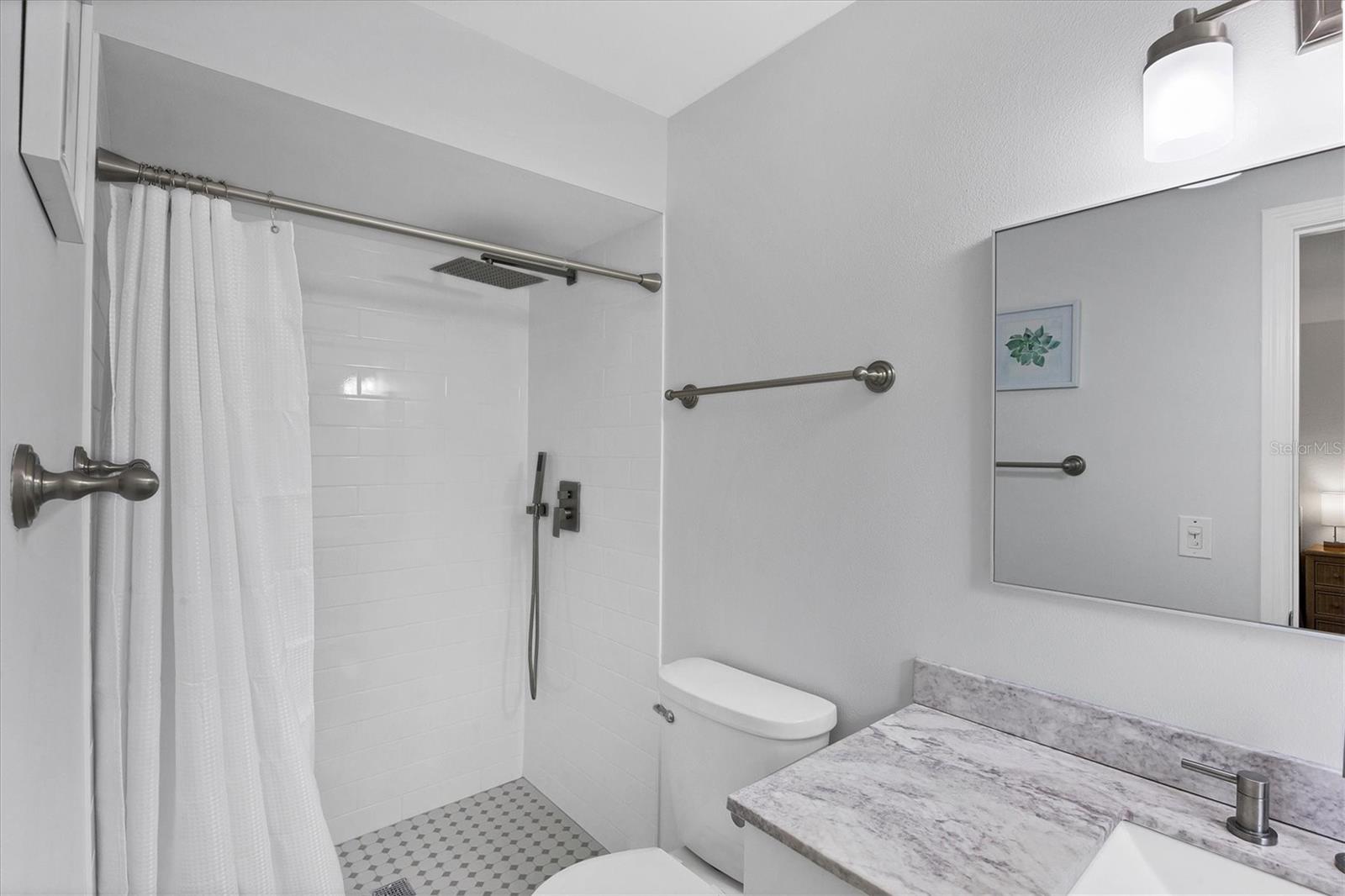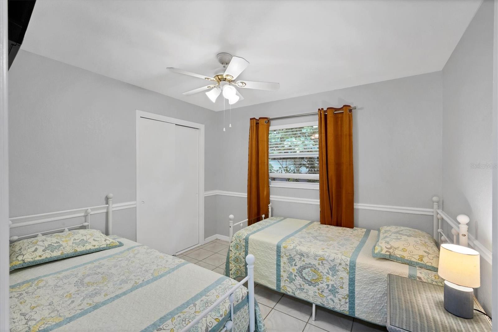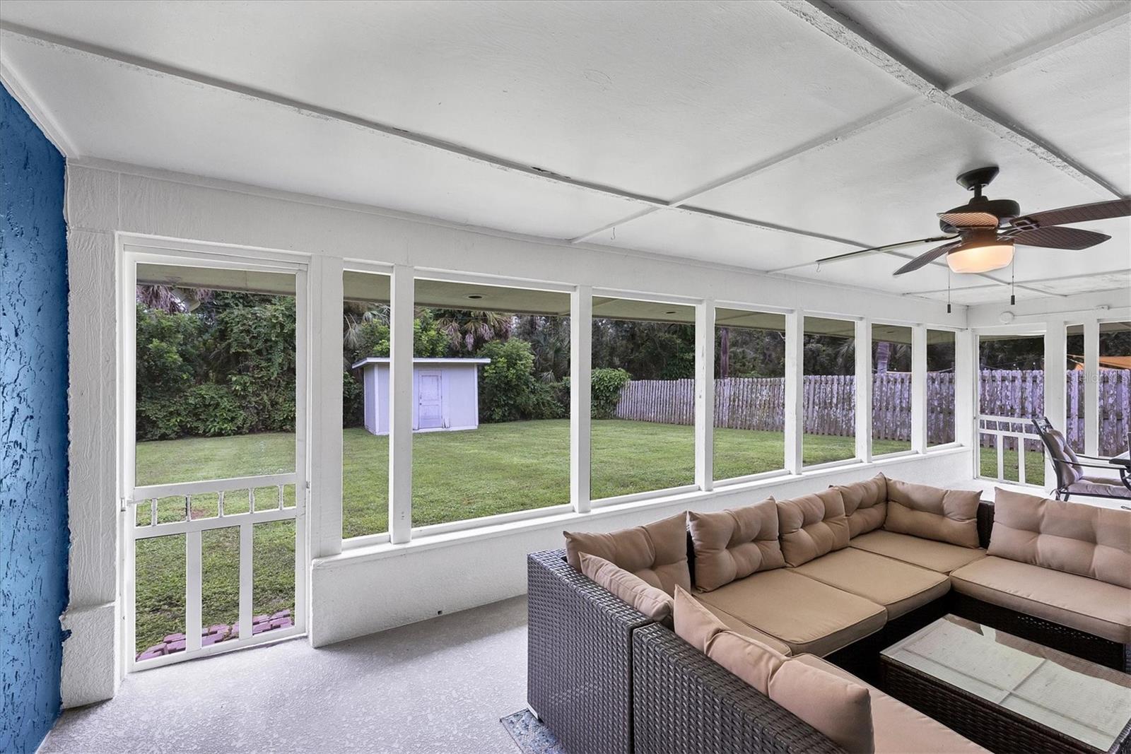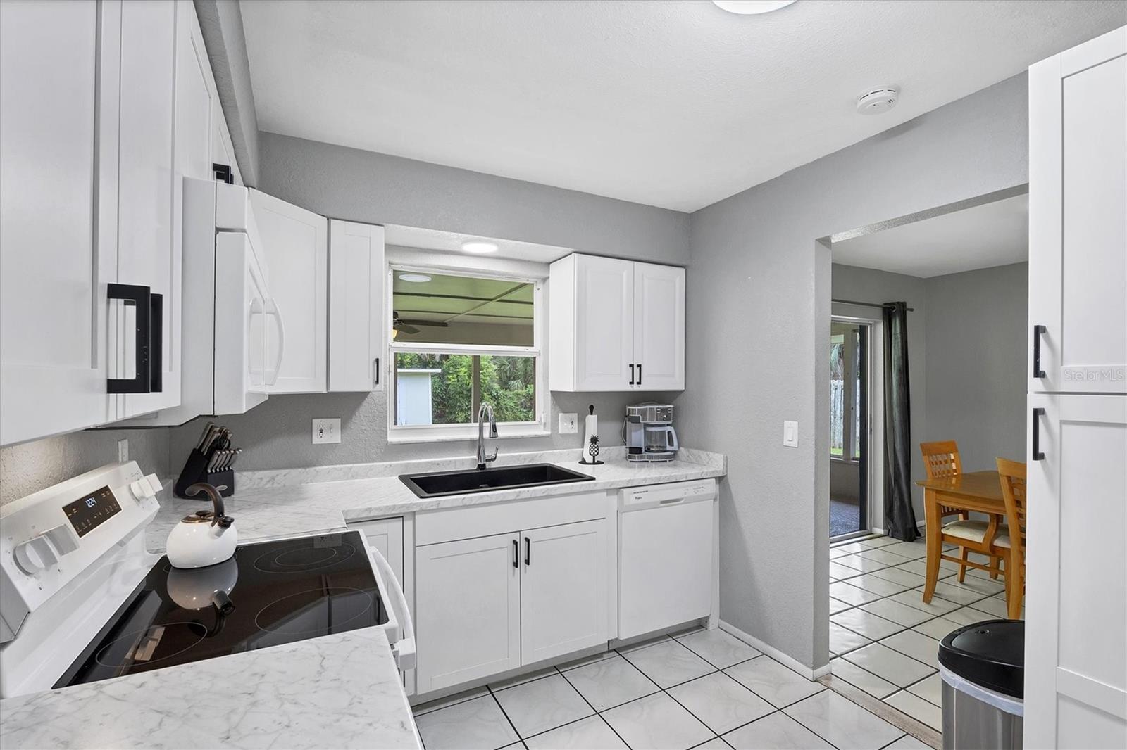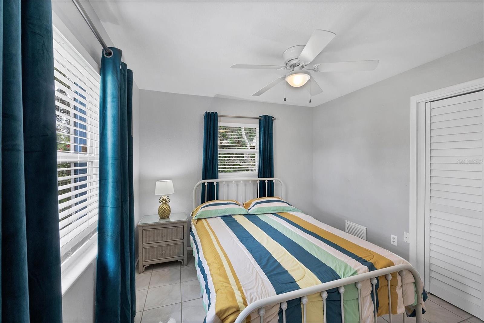 Step inside to find two tastefully remodeled bathrooms, showcasing sleek white and grey tile finishes that create a fresh, modern aesthetic. The spacious primary suite features an en-suite bathroom and French doors that open directly onto the screened-in porch, offering a seamless transition to your private outdoor oasis. The two guest bedrooms are bright and comfortable, each equipped with ceiling fans and window blinds for added privacy and comfort.