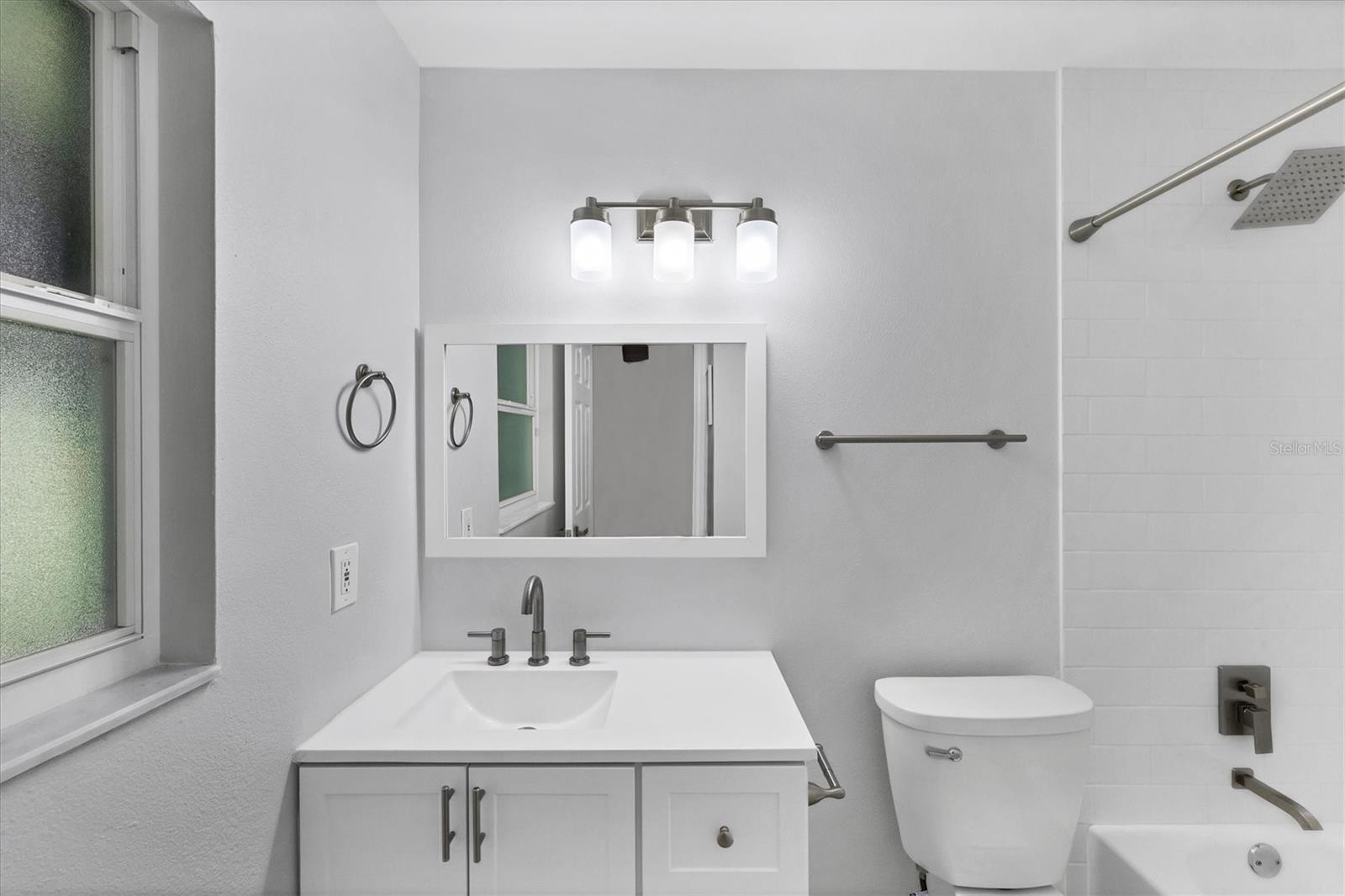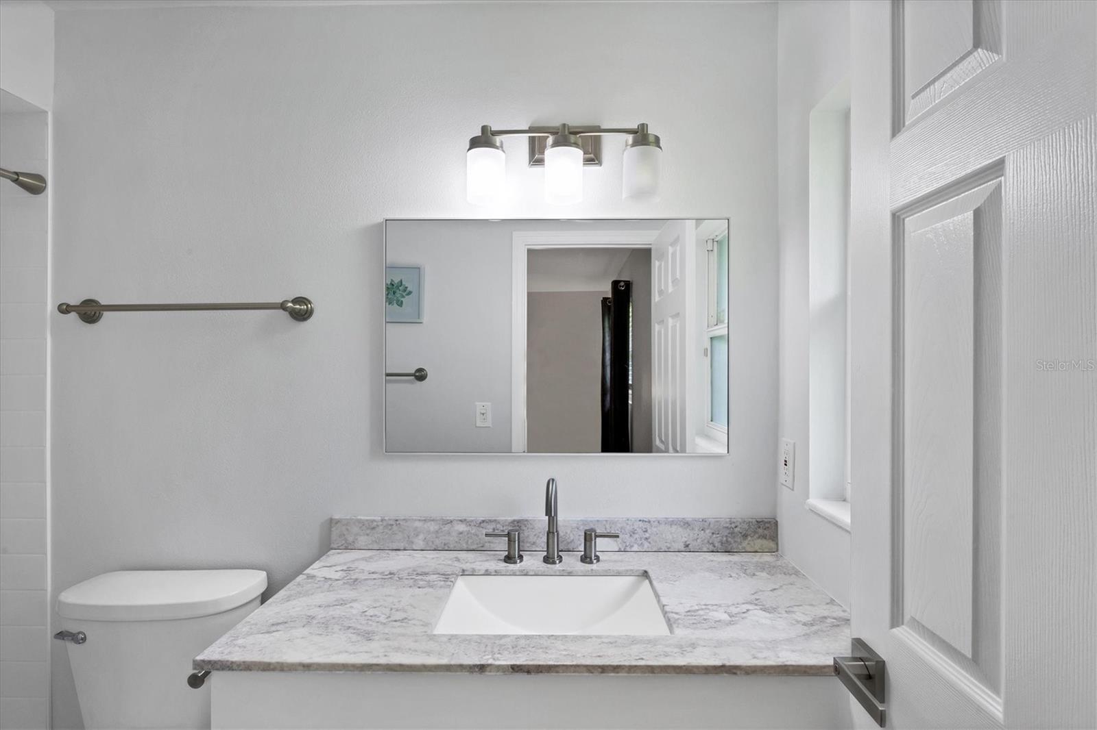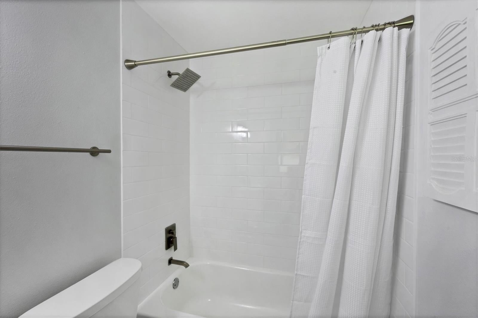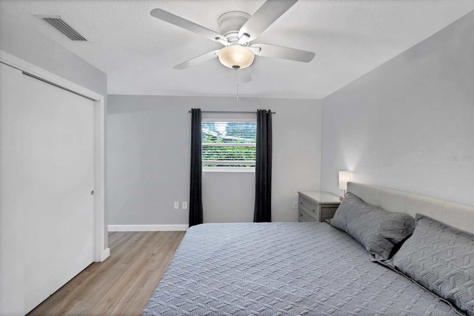 Step inside to find two tastefully remodeled bathrooms, showcasing sleek white and grey tile finishes that create a fresh, modern aesthetic. The spacious primary suite features an en-suite bathroom and French doors that open directly onto the screened-in porch, offering a seamless transition to your private outdoor oasis. The two guest bedrooms are bright and comfortable, each equipped with ceiling fans and window blinds for added privacy and comfort.