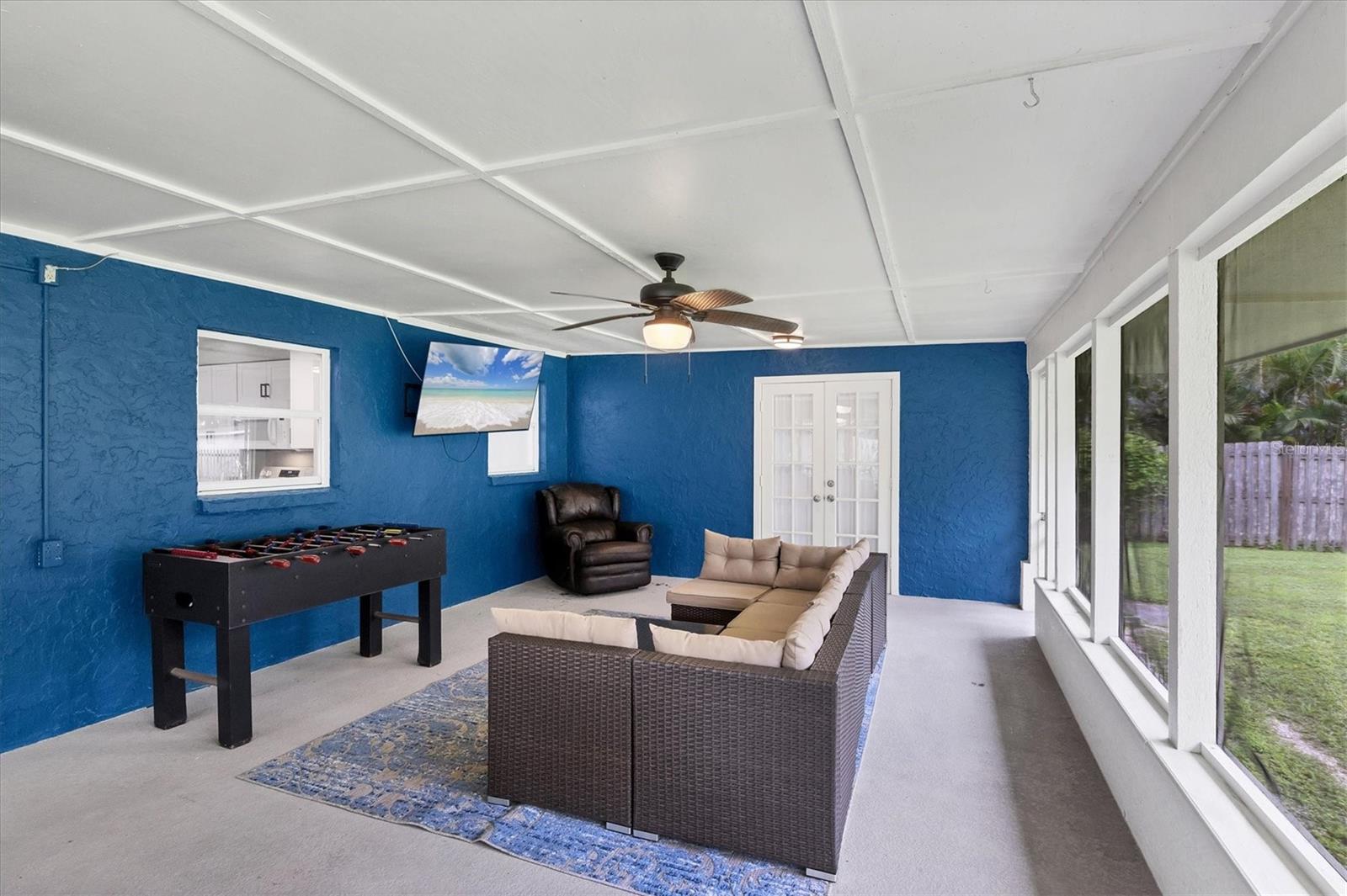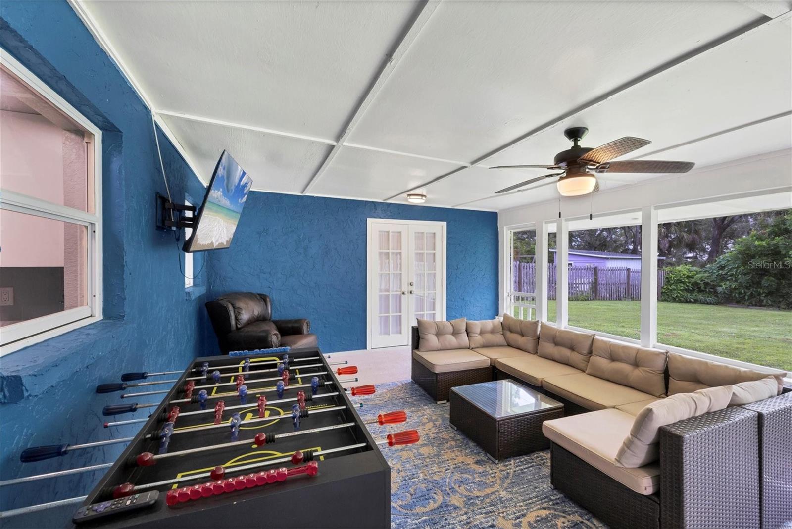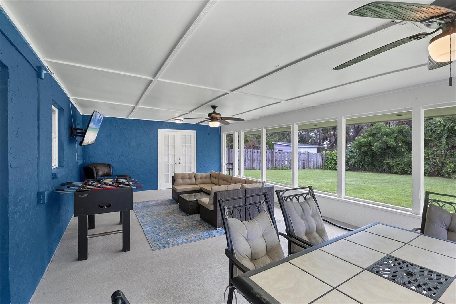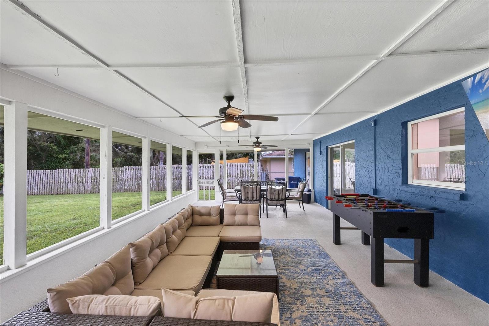 Just off the kitchen, the dedicated dining room features large sliding glass doors that lead out to the expansive covered and screened-in porch--an entertainer's dream. Enjoy outdoor dining, relaxed lounging, and game nights with a full setup that includes a dining table, cozy seating area, foosball table, and a large-screen TV.